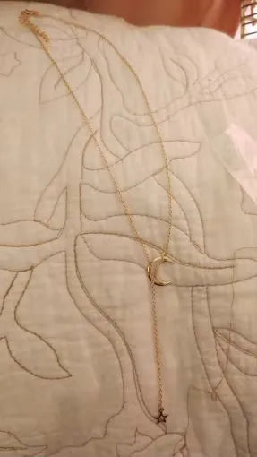 "OMG! This necklace is my new fave! Perfect for parties or casual! The moon and star design is sooooo cute and creative! Love how it elevates any outfit effortlessly and gets mad compliments!!!💫 -Susan R."